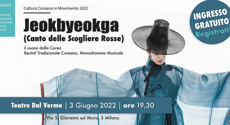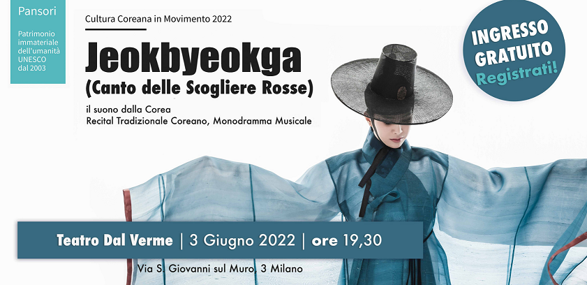 Lo spettacolo gratuito si svolgerà al Teatro Dal Verme in Via san Giovanni sul Muro, 3 martedì 3 giugno alle ore 19:30. Per l’accesso allo spettacolo, nel rispetto delle norme anti Covid, è necessaria la prenotazione: http://www.eventi.today/2022-corea-jeokbyeokga-pansori